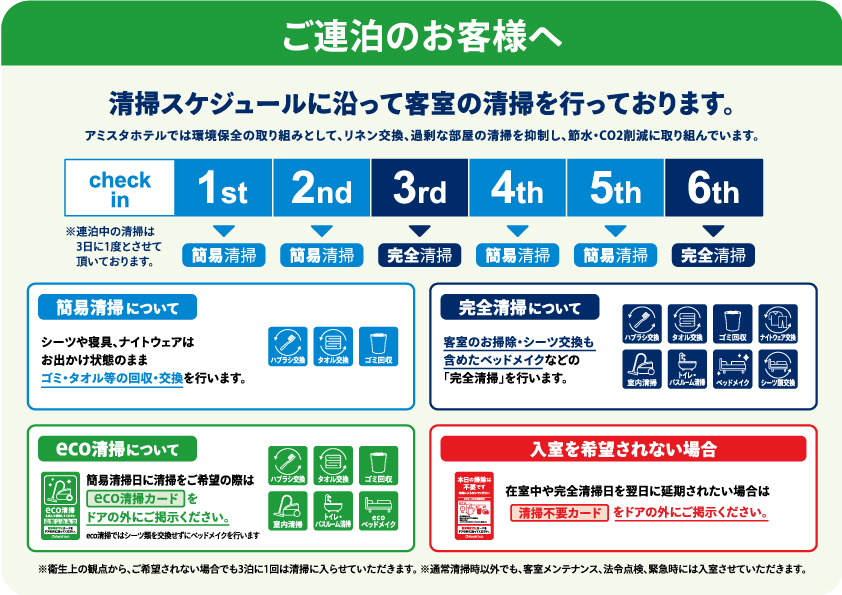 eco清掃・・・eco清掃カードをドアの外にご掲示いただければシーツを交換しないeco清掃を実施させていただきます。